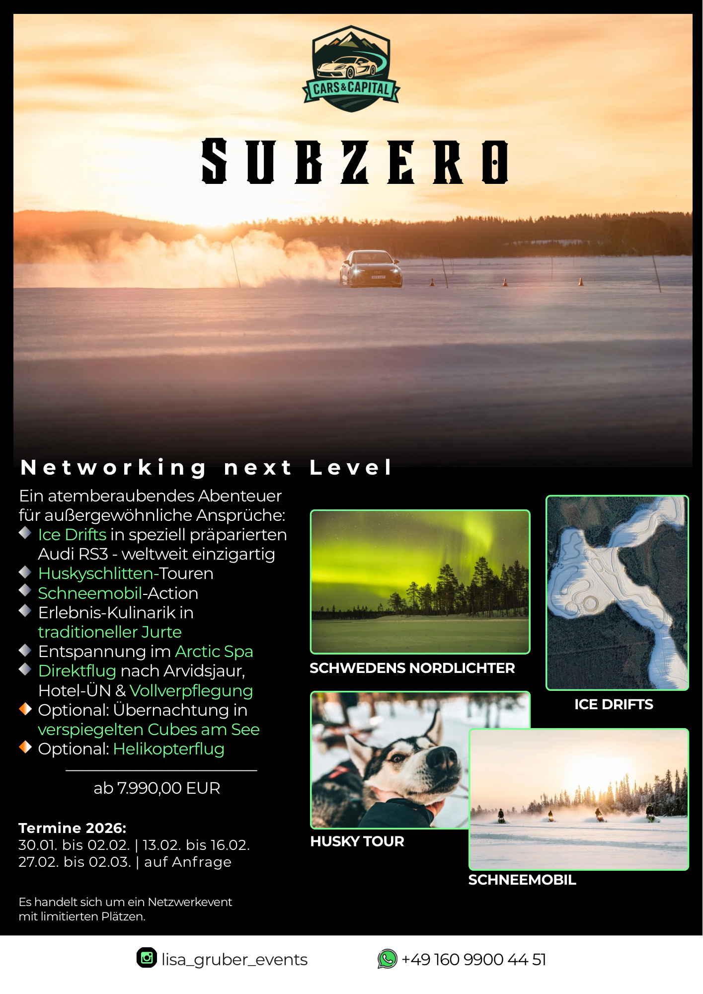 Einzigartige Netzwerk-Events für vielseitig interessierte Unternehmer: erlebe Personal Training in der Natur, exklusive Sportwagentouren, Ice Drifts in Schweden oder Österreich, Weintastings, Reisen im Privatjet und mehr.
